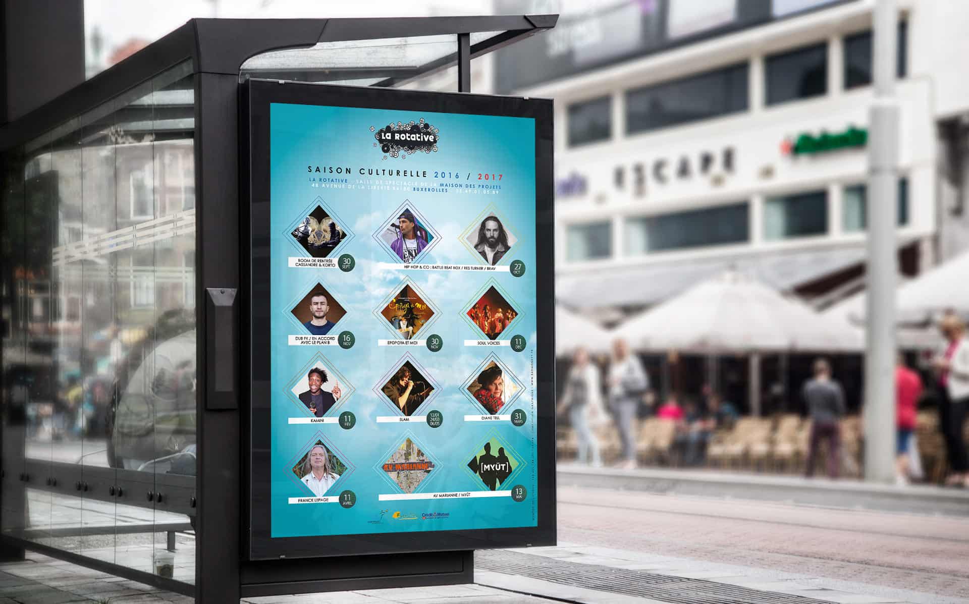 Un délai très court, 12 artistes, 10 dates, le tout dans un visuel au format Abribus, telle était la demande de la Rotative. Notre agence a relevé le défi, et nous avons répondu à leur demande dans le temps imparti ! Grâce à la réactivité de nos singes, La Rotative a pu respecter son planning et annoncer sa programmation culturelle 2016-2017.